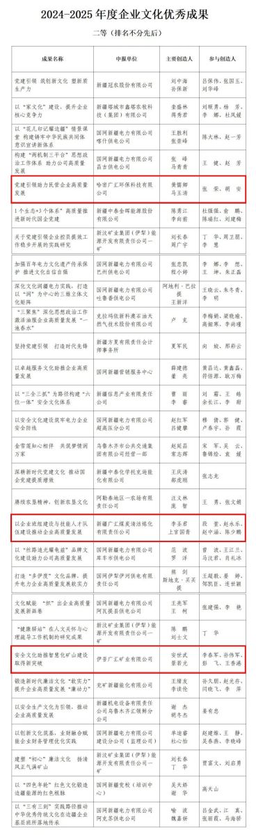 5月27日,由新疆企業(yè)聯(lián)合會(huì)、新疆企業(yè)家協(xié)會(huì)、新疆工業(yè)經(jīng)濟(jì)聯(lián)合會(huì)主辦的2024—2025年度企業(yè)文化優(yōu)秀成果發(fā)布活動(dòng),共有44項(xiàng)成果被審定為2024—2025年度企業(yè)文化優(yōu)秀成果(其中一等15項(xiàng)、二等29項(xiàng))。哈密廣匯環(huán)?萍加邢薰尽饵h建引領(lǐng)助力民營(yíng)企業(yè)高質(zhì)量發(fā)展》、廣匯煤炭清潔煉化有限責(zé)任公司《以企業(yè)班組建設(shè)與技能人才隊(duì)伍建設(shè)推動(dòng)企業(yè)高質(zhì)量發(fā)展》、伊吾廣匯礦業(yè)有限公司《安全文化助推智慧化礦山建設(shè)取得新突破》 獲評(píng)“2024—2025年度企業(yè)文化優(yōu)秀成果二等獎(jiǎng)”。